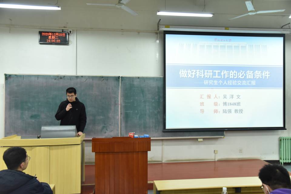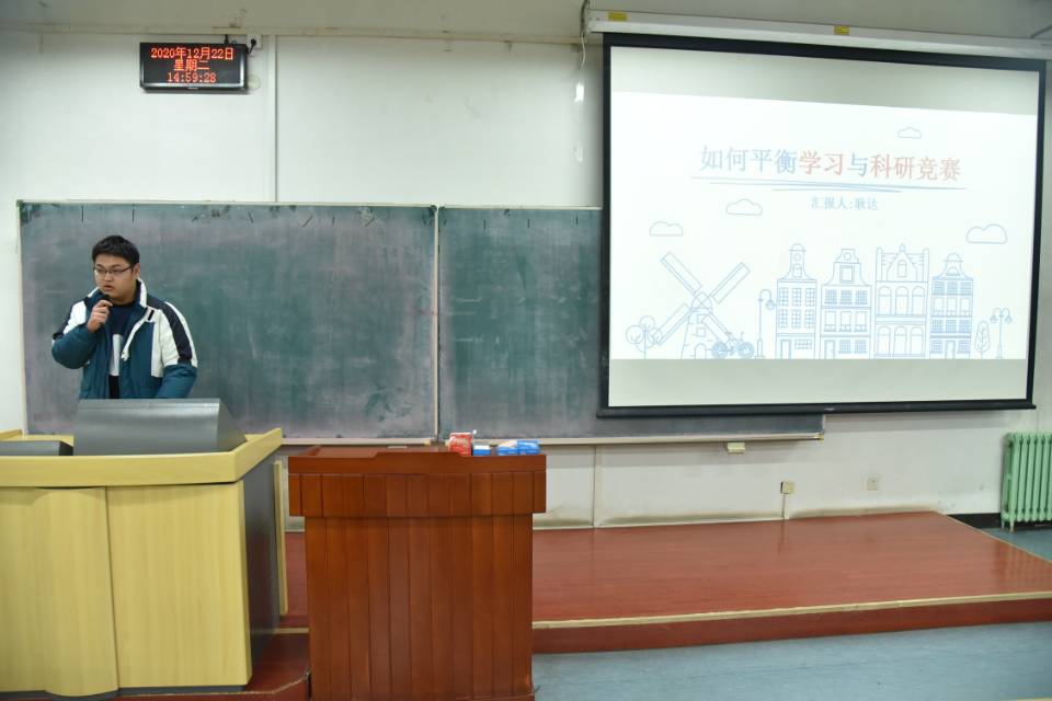 能科1802班耿达以如何平衡学习与科研竞赛为主题介绍了经验,提出“学业是根基,竞赛和科研只是锦上添花”的观点,重点介绍了其在课程学习方面的经验。他从动力管理、方法管理、科目管理几个方面细致地介绍了学习经验,又从科研方面同低年级同学进行了交流。鼓励大家积极尝试,勇于试错,并且就平衡学业与科研的时间分配方面给出了建议。