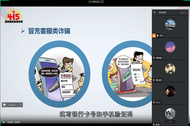 老员工具有一定的自主经济支配能力,并且还为走向社会,思想较为单纯,因此老员工也成为较易上当受骗的人群。公开课通过几个经典案例,从作案手法、方式、对象以及过程的还原,向同学们传播安全教育知识。众多的案例证明:安全事件的原因都有一个共同特点:那就是疏忽,缺乏防范意识。因此,切实做到防患于未然,提高人的安全意识尤为重要。观看结束,同学们都纷纷表示安全教育确实很值得重视,即使是在安全系数较高的校园,犯罪分子依然可以通过网络等其他方式渗透进来,实行诈骗,危害同学们的安全。大家一致认为在工作和处理问题时,需要时刻持续冷静的头脑并不断提高业务技能,以不变应万变,防范各种突发状况同时,要树立危机意识,因为事故或事件本身就是对思想麻痹者的惩罚,有时甚至是十分严重的惩戒,切莫让一时的疏忽,成为终身的遗憾。