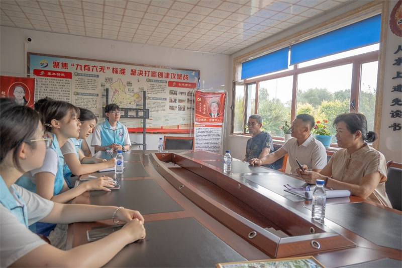 图为实践团成员与村副主任吉广顺,村妇女主任项振波,社员许永所就北沟村乡村振兴发展活动前期筹备,发展过程以及未来规划等话题进行交流访问。余金涛 供图