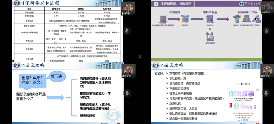 保研至华中科技大学的能科1801班的吴家葳从是什么、为什么、怎么样三个方面对保研进行了详细阐述,并针对保研情形谈了自己的独到看法;保研至清华大学能材1801班的赵洋结合自己的经历,在如何获得院内推免资格、如何选择读研学校、如何准备材料三方面分享了宝贵经验,他强调了定要关注本校的保研政策,有疑问应该及时请教老师,做好充分应对的准备;保研到北京大学能科1804班姚宇樑分别对保研的面试技巧和心态问题作了说明,对大学保研各阶段所要达成的目标给出了具体规划,他真诚地勉励同学们无论保研过程多么艰辛,都不要轻言放弃;保研至本校能科1805班的付浩从学科竞赛参与与保研夏令营的申请两方面为同学进行了介绍;行政保研至本校的能科1804班石乾铮对行政、支教保研基本条件、保研阶段的重点作了讲解,并且建议同学在获得保研资格前仍应端正心态积极备战考研或者做好找工作的两手准备。