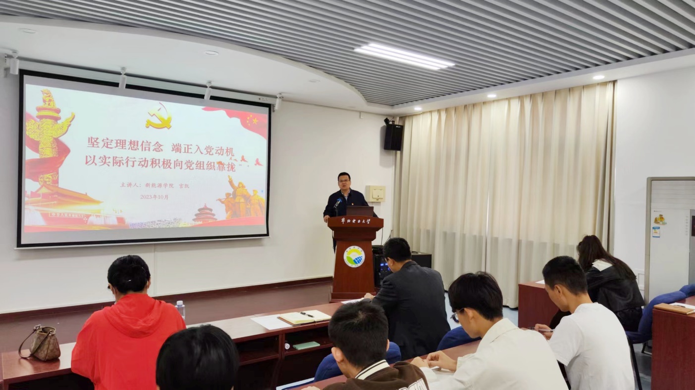 公司党委书记宫凯为培训班学员带来了主题为《坚定理想信念,端正入党动机,以实际行动积极向党组织靠拢》的第一堂党课。他首先阐释了“什么是入党动机”,“什么是正确的入党动机”;接着指明“为什么要端正入党动机”,“怎样端正入党动机”;然后以“习近平总书记的入党之路”为例,强调了正确的入党动机对党员始终保持先进性的重要作用;最后他要求培训班学员切实端正入党动机,认真学习党的二十大精神,用党员标准严格要求自己,坚持做到“四个统一”,积极参加学校学院组织的各项活动,做好身边小事,在日常学习生活中展现入党积极分子的先进性,以实际行动入党。他还鼓励学员们将个人发展与新能源行业的发展同频共振,为国家“双碳”目标的推进贡献华电新能源人的力量。
