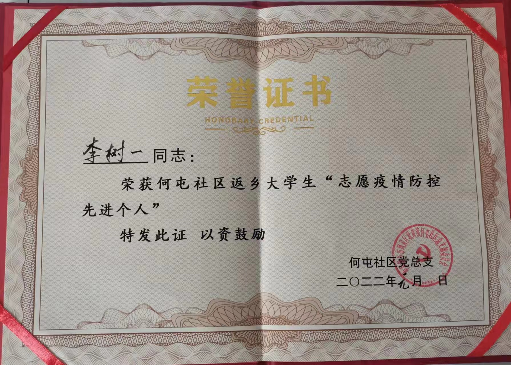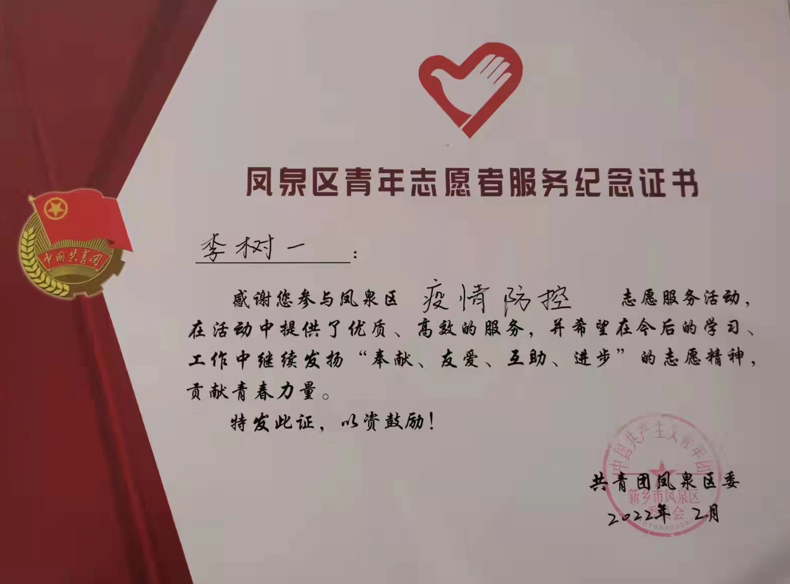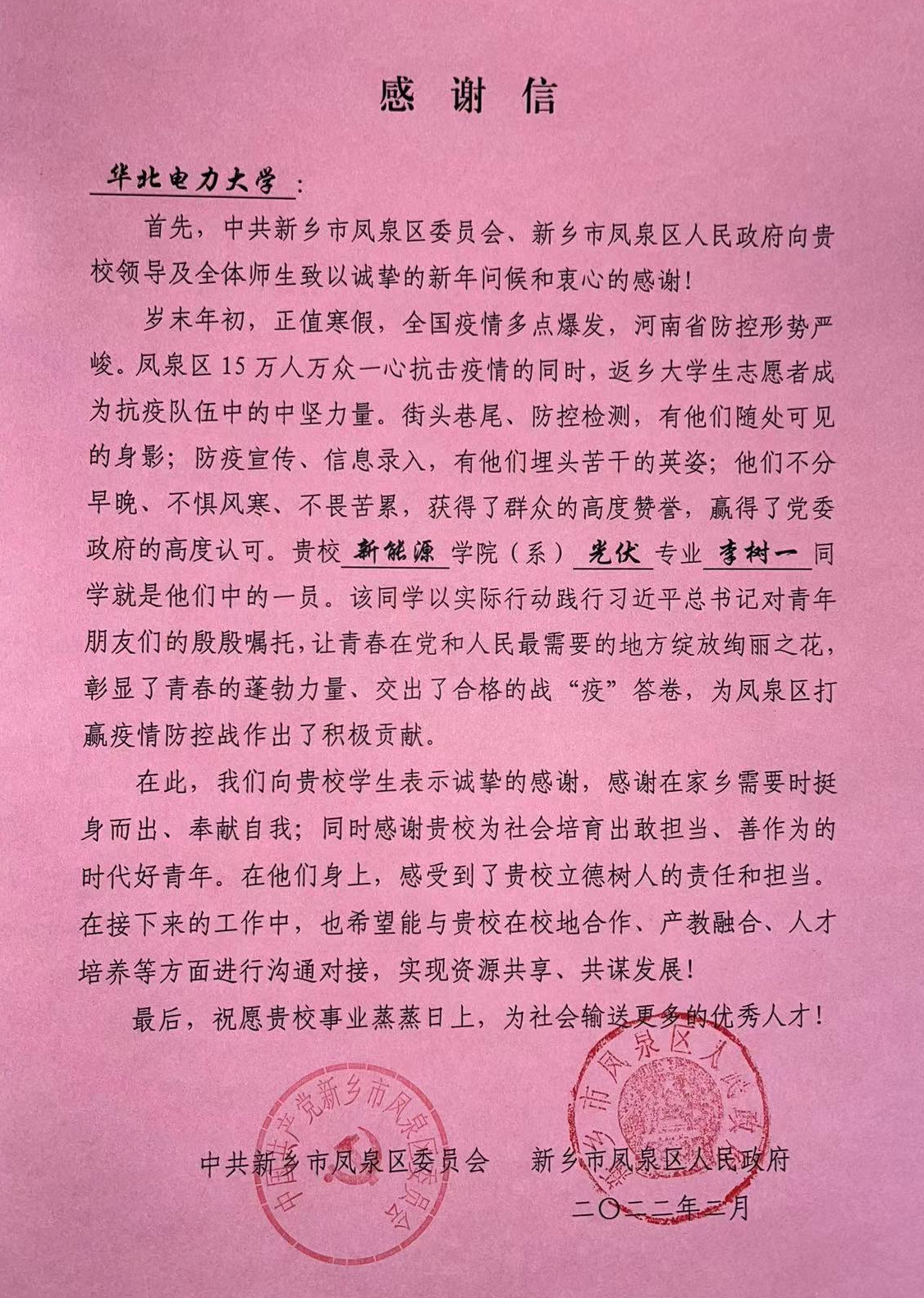 志愿服务期间,李树一不仅出色的完成了防疫工作,还收到了中共新乡市凤泉区委员会、凤泉区人民政府发给学校的感谢信,并被评为“志愿疫情防控先进个人”荣誉称号。