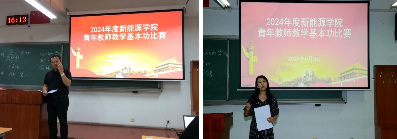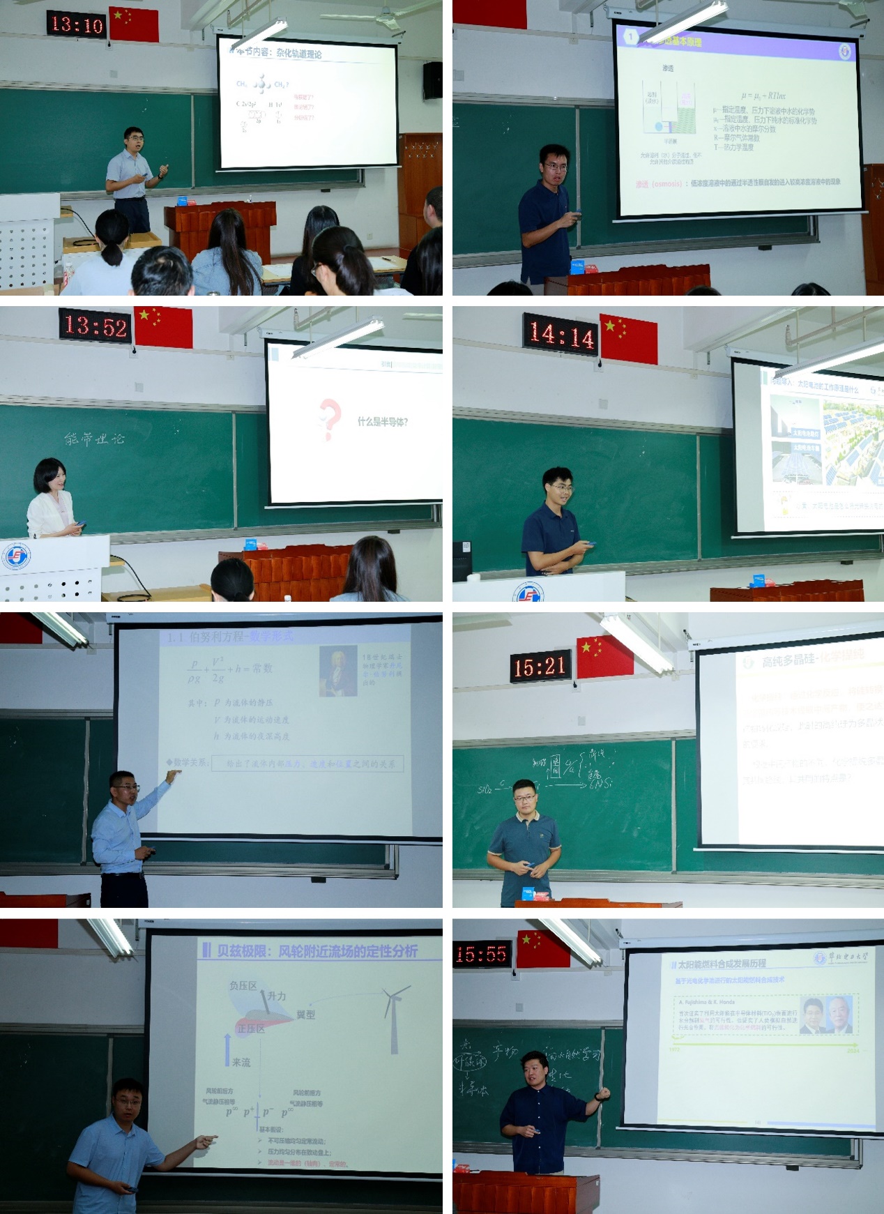 八位青年教师参加了比赛,各位选手充分展示了自己的教学风采,李新涛老师通过小实验和高铁安全黄线等生活案例,生动讲解了伯努利方程的物理内涵及实际应用;胡斌老师以化学家鲍林的视角讲解了杂化轨道理论的内涵和应用;孟航老师通过流体力学方法导出了风力机效率的理论极限;冯钰贻老师通过生动形象的类比和案例分析,讲解了能带理论的形成和应用;徐明新老师通过海鸥喝水的仿生案例,生动介绍了反渗透的原理和应用;黄浩老师通过情景预设引入太阳电池,并通过问题驱动的方式讲授了太阳电池的工作原理;孙鑫老师通过类比自然界光合作用,形象讲解了光电化学燃料合成的原理与方法;刘雪朋老师结合经典提纯方式讲述了晶硅太阳电池制造中三氯氢硅氢还原法的原理和过程。